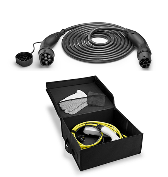 Folding box for electric charging cable. Dimensions LWH: 40 cm x 37 cm x 15 cm. Includes gloves and cleaning cloth in inner net. Velcro fasteners for attaching the cable(s). Logo on the lid Non-slip underside. Foldable. Designed for easy insertion/removal of the cable Cable does not lie “loose” in the luggage compartment. Colour: black with grey decorative border.